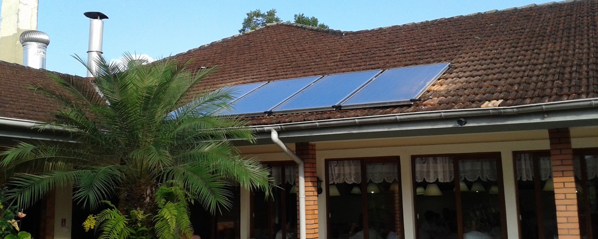 As potentes placas solares instaladas no telhado aquecem a água que passa por seus tubos e as armazena dentro do reservatório térmico para ser usada posteriormente pela família.